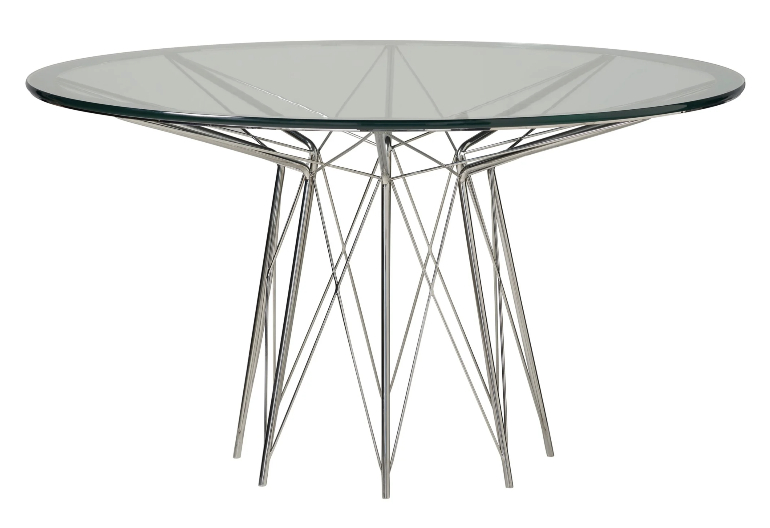 An airy yet intricate silver base paired with a round glass top define the Modern Round Dining Table, a stylish statement piece unique in silhouette and sleek in material.